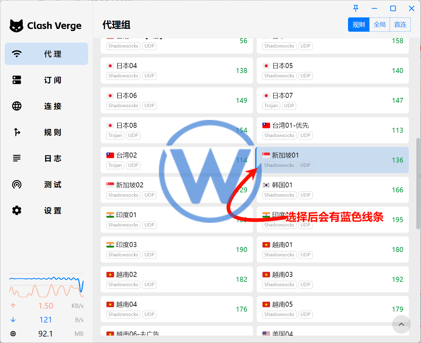 然后在代理页面选择节点(默认选择的是直连)