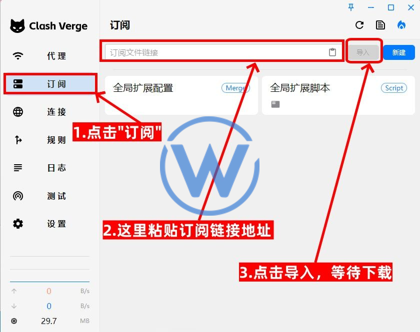 拷贝后,我们在Clash Verge Windows 里面添加订阅如果下载配置文件出现Network Error错误,请更换一个订阅地址,因为我们网站有3个订阅地址,或者更换不同 WiFi 网络,或将电脑通过手机的4G/5G热点上网进行尝试