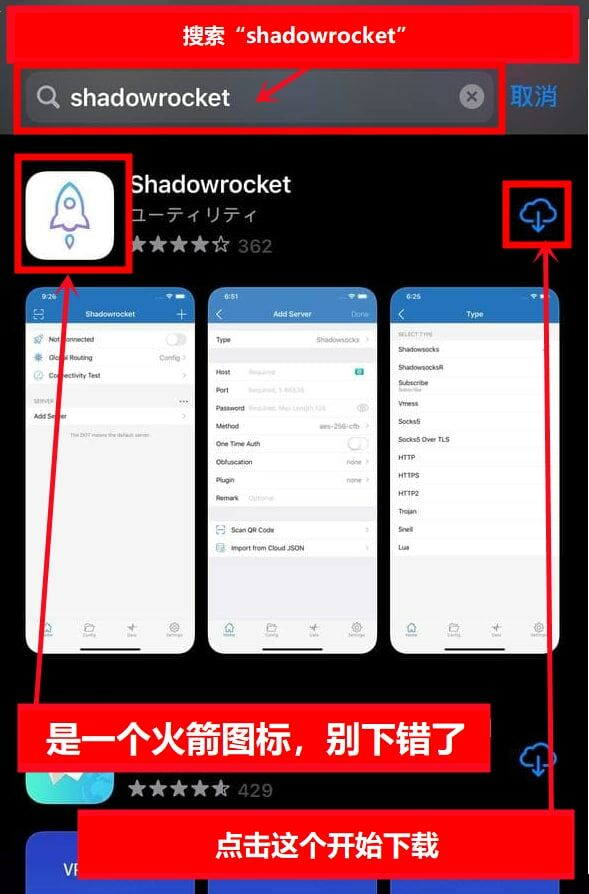 进商店搜索:Shadowrocket 图标是一个小火箭的LOGO,别下错了
